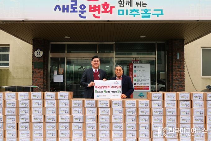 [ 한국미디어뉴스 최치남 기자 ] 인천 미추홀구는 12일 구청장실에서 ‘미추홀구를 사랑하는 사람들의 모임’으로부터 관내 저소득 취약계층을 위한 280만 원 상당의 떡국 세트를 전달받았다.