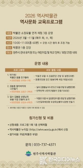 [ 한국미디어뉴스 이원영 기자 ] 원주시역사박물관은 오는 3월부터 11월까지 ‘2026년 역사문화 교육프로그램’을 운영한다.