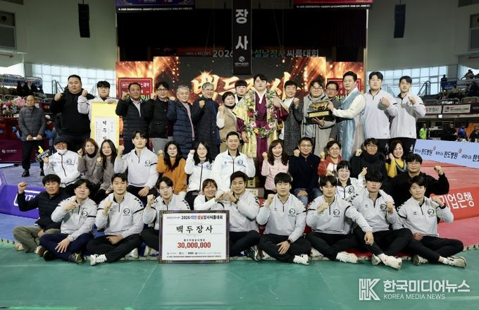 [ 한국미디어뉴스 이종철 기자 ] 영암군민속씨름단 김민재 장사가 18일 충남 태안종합실내체육관에서 열린 ‘2026 위더스제약 태안설날장사씨름대회’ 140kg 이하 백두급에서 우승하며 설날장사 타이틀을 거머쥐었다.