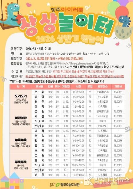 [ 한국미디어뉴스 김풍옥 기자 ] 청주오송도서관은 오는 2월 28일까지 청주시 영유아와 양육자를 대상으로 ‘청주 아이러북(LoveBook)’ 상반기 책놀이 프로그램 수강생을 모집한다고 20일 밝혔다.