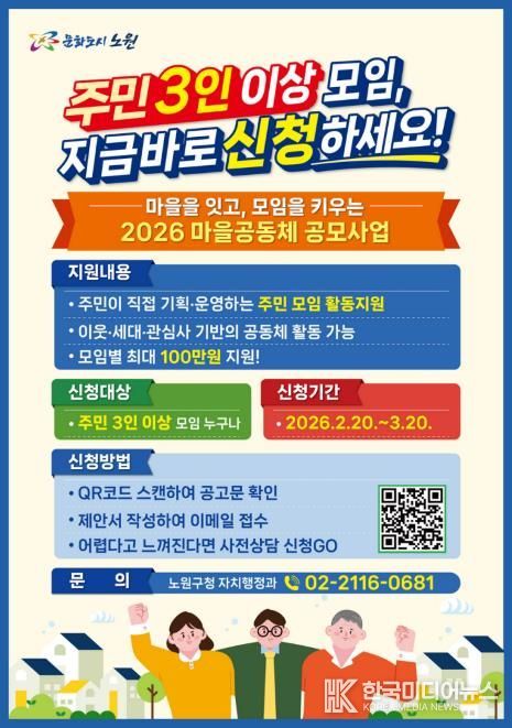 [ 한국미디어뉴스 이보영 기자 ] 서울 노원구가 오는 3월 20일까지 2026년 마을공동체 활성화를 위한 '주민주도형 공모사업' 참여팀을 모집한다고 밝혔다.