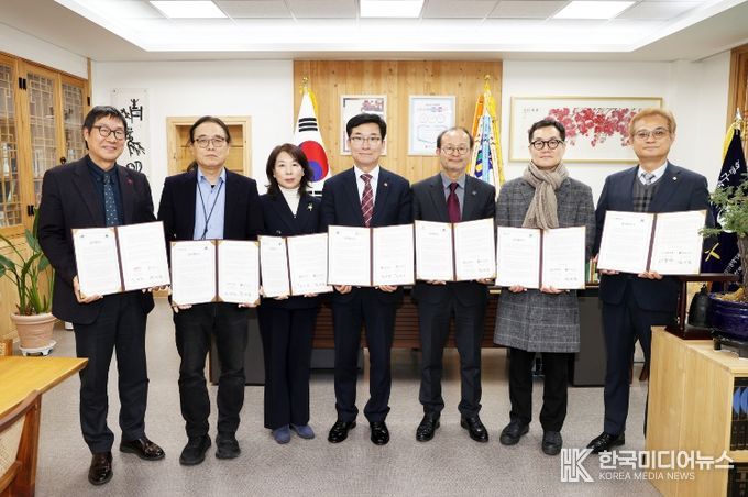 [ 한국미디어뉴스 김풍옥 기자 ] 충청북도교육청은 23일, 서원대학교(총장 손석민), 세명대학교(총장 권동현), 충북문화재단(대표이사 김경식), 청주시문화산업진흥재단(대표이사 변광섭), 충북민예총(이사장 김덕근), 충북예총(회장 이영석) 등 지역 예술 기관‧단체와 함께 교육감실에서 '나도 예술가' 정책 추진과 안착을 위한 업무협약을 체결했다.
