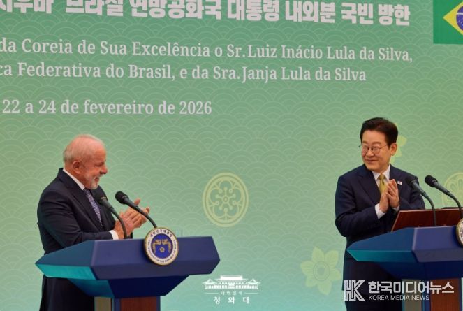 [ 한국미디어뉴스 황영수 기자 ] 이재명 대통령과 루이스 이나시우 룰라 다시우바 브라질 대통령은 23일 정상회담을 갖고, 양국 관계를 '전략적 동반자 관계'로 격상시키기로 하고, 이를 이행하기 위한 '한-브라질 4개년 행동계획'을 채택했다.