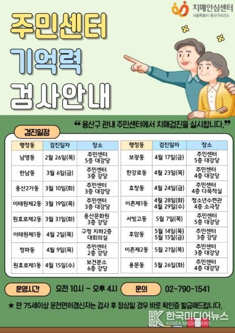 검사 대상은 치매 진단을 받지 않은 용산구 주민이며, 1인당 연 1회 무료로 참여할 수 있다.