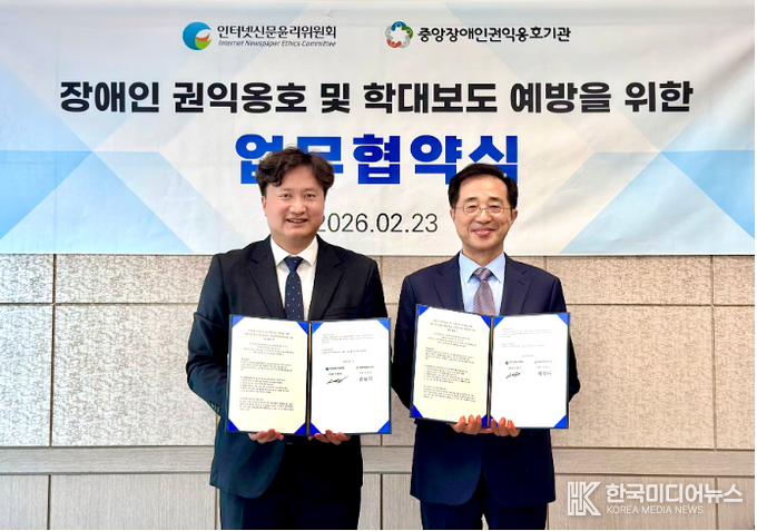 [ 한국미디어뉴스 이원영 기자 ] 인터넷신문윤리위원회(위원장 이재진, 이하 인신윤위)는 언론유관단체로는 처음으로 보건복지부 위탁 ‘중앙장애인권익옹호기관(관장 박정식)과 23일, 중앙장애인권익옹호기관 회의실에서 업무협약을 맺었다고 24일 밝혔다.(사진 참조)