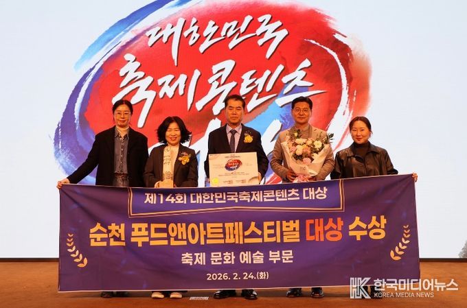 [ 한국미디어뉴스 이종철 기자 ] 순천시는 대표 문화관광축제인 ‘순천 푸드앤아트페스티벌’이 24일 서울 용산구 피스앤파크 컨벤션에서 열린 ‘제14회 대한민국축제콘텐츠대상’ 시상식에서 문화·예술 부문 대상을 수상했다고 밝혔다.