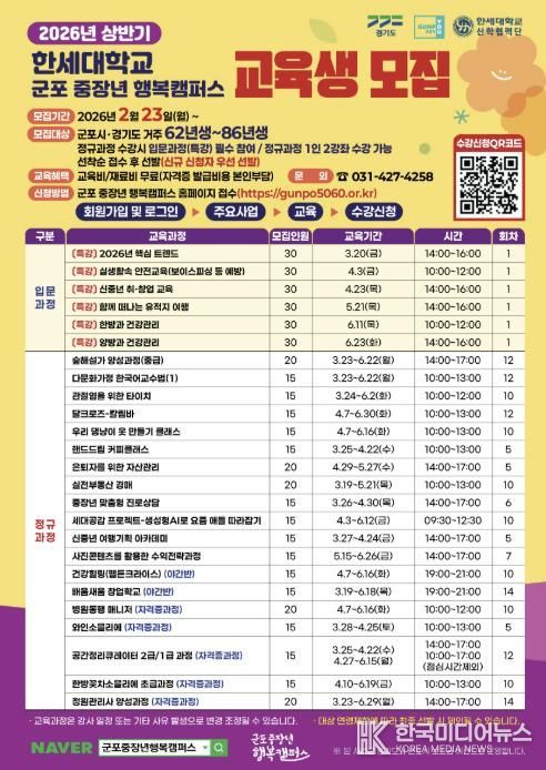 군포시 관계자는 “중장년 세대가 변화하는 사회 환경에 능동적으로 대응하고, 배움과 교류를 통해 새로운 기회를 모색할 수 있도록 다양한 교육과정을 마련했다”며 “많은 시민들의 관심과 참여를 바란다”고 밝혔다.