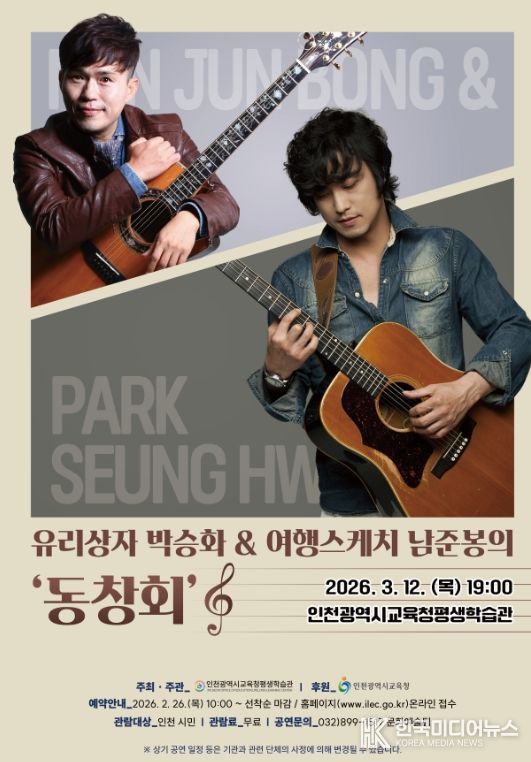 [ 한국미디어뉴스 이원영 기자 ] 인천광역시교육청평생학습관은 시민의 다양한 문화예술 향유를 위하여, 3월 12일 교육누리홀에서 ‘유리상자 박승화 & 여행스케치 남준봉’ 음악 공연을 개최한다.