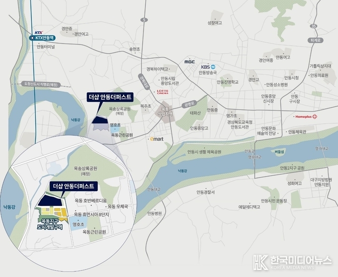 단지는 약 6만5,404㎡ 규모의 옥동지구 도시개발사업지 내에 들어선다. 안동에서 추진 중인 도시개발사업 가운데 비교적 빠른 속도로 조성되고 있는 지역으로, 체계적인 기반시설 확충과 주거 환경 개선에 따른 주거 선호도 상승이 기대되는 입지다.