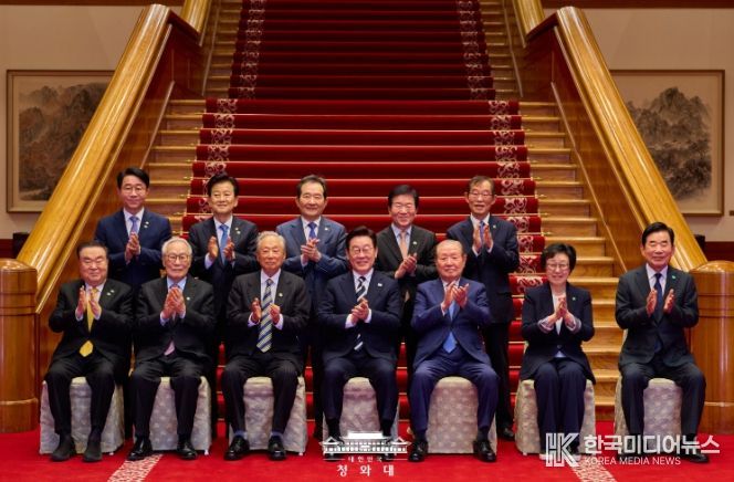 [ 한국미디어뉴스 황영수 기자 ] 이재명 대통령은 오늘 청와대 본관에서 1시간 45분 동안 민주당 상임고문 열 분과 오찬 간담회를 가졌다. 참석자는 권노갑 고문과 김원기·임채정·문희상·김진표·정세균·박병석 전 국회의장, 한명숙 전 총리, 정동영 통일부 장관, 이용득 고문이다.