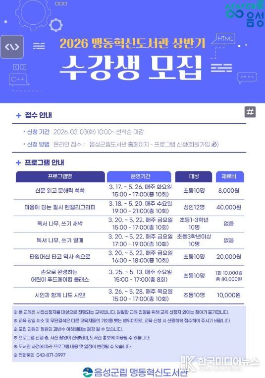 [ 한국미디어뉴스 김풍옥 기자 ] 음성군 맹동혁신도서관이 ‘2026 상반기 문화교실’ 참여자를 모집한다.