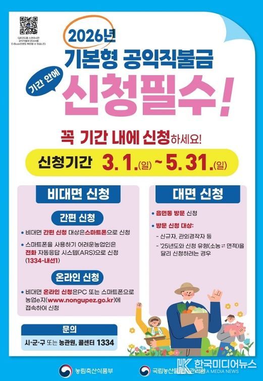 [ 한국미디어뉴스 김풍옥 기자 ] 제천시는 2026년 ‘기본형 공익직불금’ 신청을 3월 1일부터 5월 31일까지 접수한다.