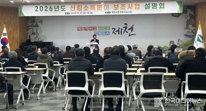[ 한국미디어뉴스 김풍옥 기자 ] 제천시는 지난 25일 시청 대회의실에서 임업인 경쟁력 강화를 위해 ‘2026년 산림소득분야 보조사업 주민설명회’를 개최했다.