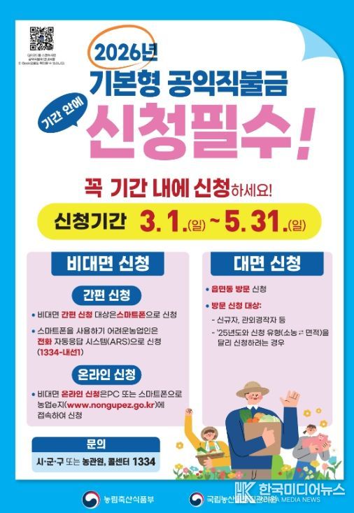 [ 한국미디어뉴스 김풍옥 기자 ] 충북 영동군은 3월 1일부터 5월 31일까지 ‘2026년도 기본형 공익직접지불금 등록 신청을 받는다.