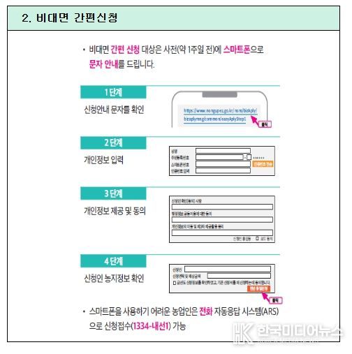 금년의 경우 신청 편의성 제고를 위해 스마트폰 등을 이용한 비대면 신청기한을 1개월에서 3개월로 확대했다. 신청일 기준으로 농업경영체 등록정보가 지난해와 변동이 없는 농업인은 비대면 간편신청이 가능하며, 별도의 서류 제출 없이 스마트폰이나 전화자동응답시스템(ARS)를 이용해 신청이 가능하다. 이들에게는 문자메시지(SMS) 등을 통해 3월 3일부터 신청을 안내할 예정이다. 또한, 간편신청이 불가한 농업인·법인은 인터넷에 접속하여 비대면 신청이 가능하도록 신청방식을 추가 도입하여 농업인들이 보다 편리하게 신청할 수 있게 했다.
