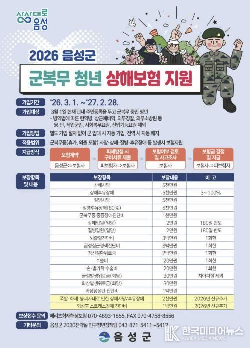 [ 한국미디어뉴스 김풍옥 기자 ] 음성군은 군복무 중인 지역 청년들이 예기치 못한 사고로부터 충분한 보장을 받을 수 있도록 ‘2026년 군복무 청년 상해보험 지원사업’을 추진한다고 밝혔다.