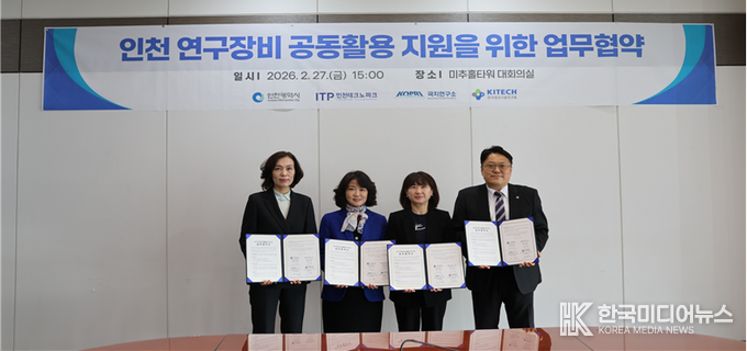 [ 한국미디어뉴스 이원영 기자 ] 인천광역시(시장 유정복)는 지난 2월 27일 인천 미추홀타워 대회의실에서 인천테크노파크, 극지연구소, 한국생산기술연구원과 함께 「인천 연구장비 공동활용 지원사업」추진을 위한 업무협약(MOU)을 체결했다고 밝혔다.