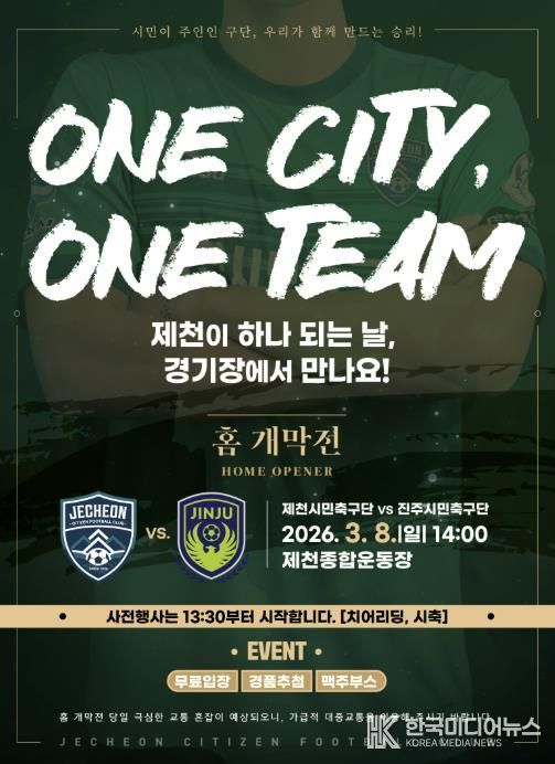 [ 한국미디어뉴스 김풍옥 기자 ] 제천시민축구단이 오는 3월 8일 오후 2시, 제천종합운동장에서 역사적인 홈 개막전을 연다.