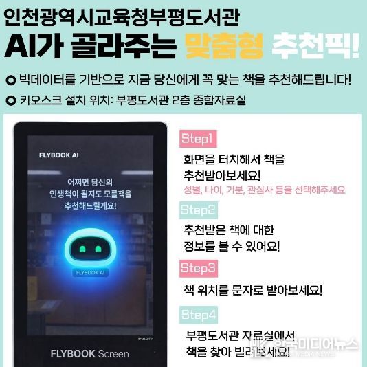 [ 한국미디어뉴스 이원영 기자 ] 인천광역시교육청부평도서관은 빅데이터와 인공지능(AI)을 활용한 개인 맞춤형 도서 추천 서비스인 ‘플라이북 키오스크’를 운영한다고 3일 밝혔다.