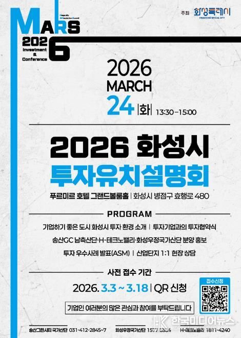 [ 한국미디어뉴스 이원영 기자 ] 화성특례시가 오는 3월 24일 푸르미르 호텔에서 ‘2026 화성특례시 투자유치 설명회’를 개최하고, 3월 3일부터 3월 18일까지 QR코드를 통한 사전접수를 진행한다.