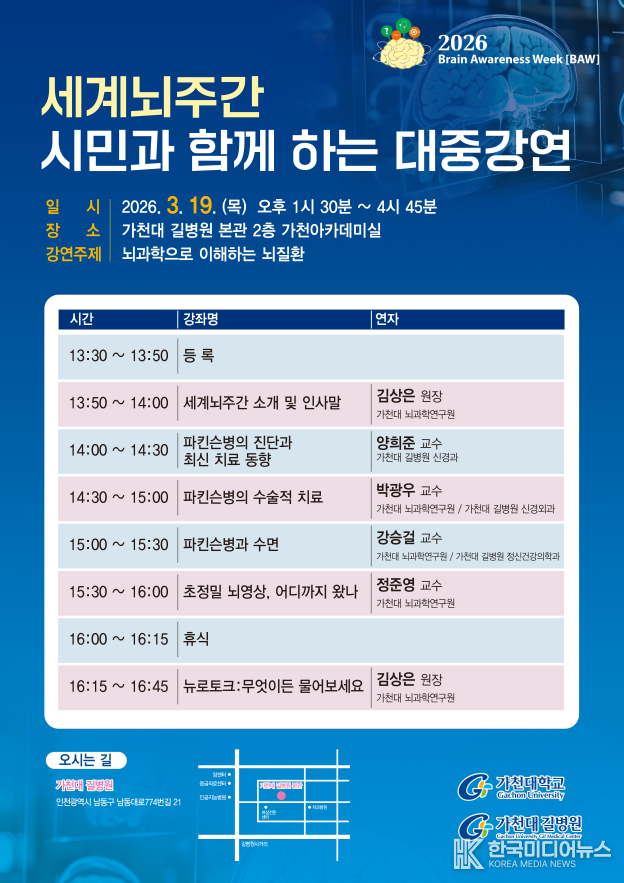 ‘2026 세계 뇌주간 행사’는 한국뇌신경과학회와 한국뇌연구원이 주최하며, 가천대 뇌과학연구원, 가천대 길병원이 주관하는 인천 지역을 포함해 전국 9개 지역에서 16일부터 22일까지 개최된다.