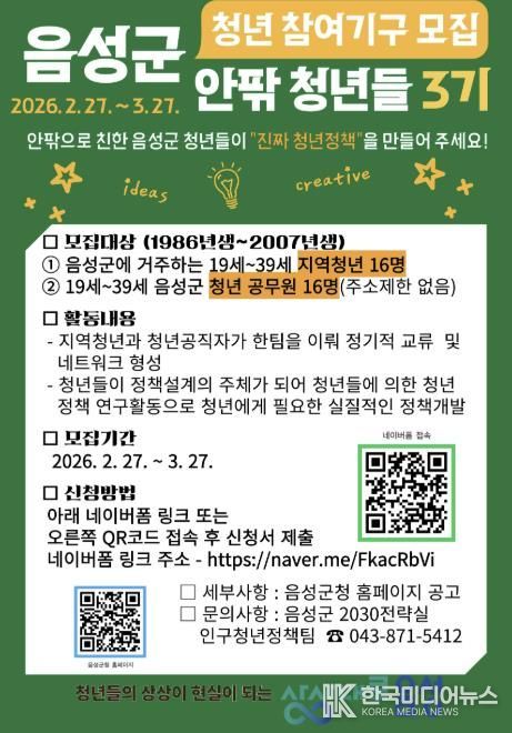 [ 한국미디어뉴스 김풍옥 기자 ] 음성군은 청년공무원과 지역청년이 협력하여 청년에 의한 ‘진짜’ 청년정책을 만드는 청년 참여기구 ‘안팎 청년들 3기’ 참여자를 모집한다고 밝혔다.