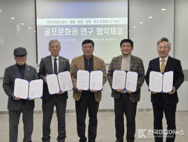 [ 한국미디어뉴스 김만길 기자 ] 부천문화원과 강서문화원, 계양문화원, 김포문화원, 부평문화원은 3월 4일 부천문화원에서 ‘굴포문화권’을 토대로 하는 연구교류 협약식을 체결했다. 이로써 ‘굴포’를 같은 문화권으로 하는 부천문화원·강서문화원·계양문화원·김포문화원·부평문화원은 학술대회와 콘텐츠 발굴 사업 등 다양한 지역학 자원을 발굴하고 활성화하기 위해 최초로 지역학 연구 모델을 구축하게 됐다. 특히, 이번 협약은 경기도(부천, 김포), 서울특별시(강서), 인천광역시(계양, 부평)를 잇는 ‘지역학’중심의 연구 교류를 마련한다는 점에서 주목된다.