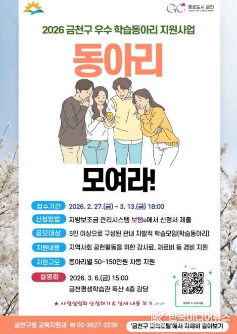 [ 한국미디어뉴스 이원영 기자 ] 금천구는 오는 13일까지 ‘우수 학습동아리 지원사업’에 참여할 동아리를 공개모집한다고 밝혔다.