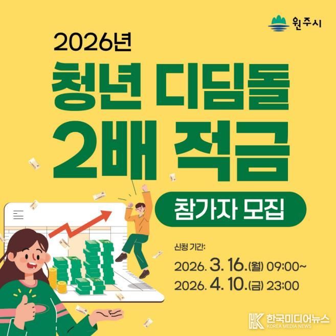 [ 한국미디어뉴스 이원영 기자 ] 원주시는 청년 근로자의 경제적 자립과 자산 형성 기회를 제공하고, 기업의 고용안정과 장기 재직을 촉진하기 위해 ‘2026년 청년 디딤돌 2배 적금’ 신청자를 모집한다.