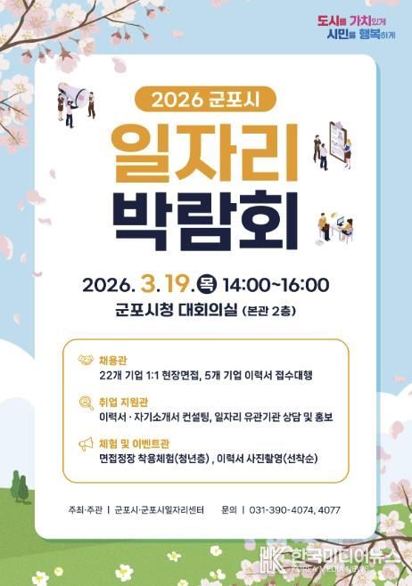 [ 한국미디어뉴스 이보영 기자 ] 군포시는 오는 3월 19일 오후 2시부터 시청 대회의실에서 ‘2026년 군포시 일자리 박람회’를 개최한다. 이번 박람회는 지역 내 우수 기업과 구직자가 직접 만나는 채용의 장으로 제조, 서비스, 물류배송, 의료복지 등 다양한 분야에서 폭넓은 취업 기회를 제공할 예정이다.