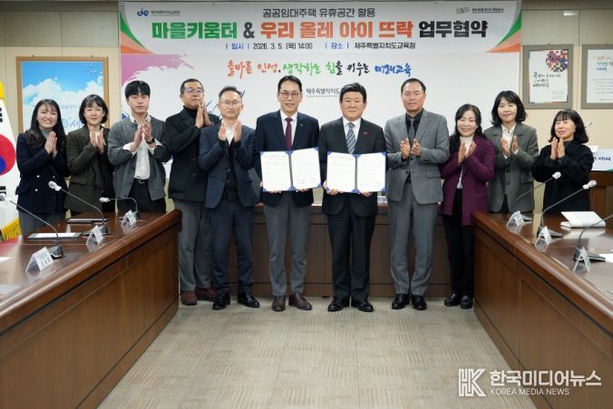 [ 한국미디어뉴스 이원영 기자 ] 제주특별자치도교육청은 제주특별자치도개발공사와 5일 도교육청 상황실에서 공공임대주택 유휴공간을 활용한 ‘우리 올레 아이 뜨락’ 사업과 도교육청 ‘2026 마을키움터 운영’ 사업의 상호 협력을 위한 업무협약을 체결했다.