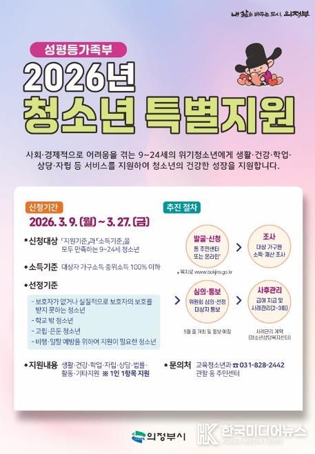 [ 한국미디어뉴스 민경환 기자 ] 의정부시는 3월 9일부터 27일까지 ‘2026년 청소년 특별지원’ 사업 대상자를 모집한다.