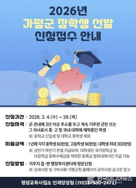 [ 한국미디어뉴스 김서안 기자 ] 가평군이 지역 학생들의 균등한 교육 기회를 보장하고 우수 인재를 육성하기 위해 2026년도 장학생 선발에 나선다.