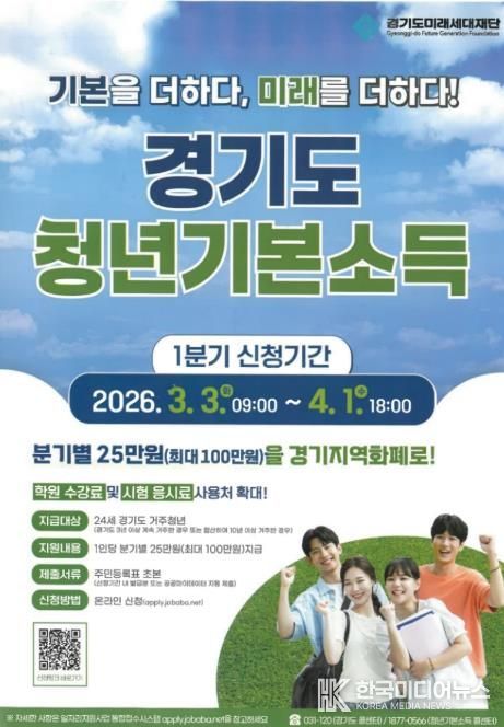 [ 한국미디어뉴스 이보영 기자 ] 오산시는 24세 청년에게 분기별 25만 원을 지급하는 ‘청년기본소득’ 2026년 1분기 신청을 3월 3일부터 4월 1일까지 접수한다고 밝혔다.