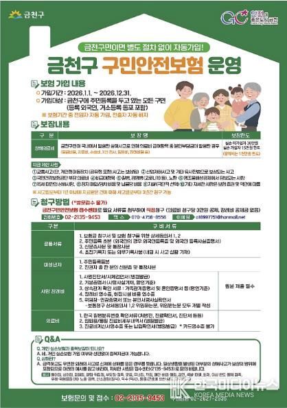 [ 한국미디어뉴스 이원영 기자 ] 금천구는 2023년 하반기부터 금천구 모든 구민을 대상으로 시행하고 있는 ‘구민안전보험’을 올해부터 일부 보장 기준을 개선해 운영한다고 밝혔다.