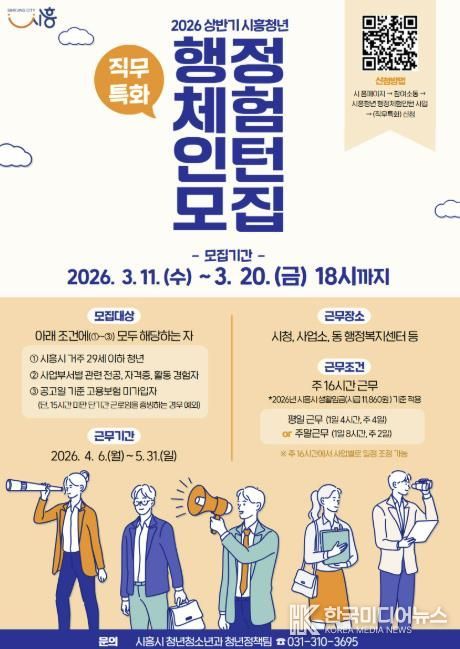 [ 한국미디어뉴스 이보영 기자 ] 시흥시는 지역 청년들의 실질적인 일 경험과 진로 탐색을 지원하기 위해 ‘2026년 (직무특화) 상반기 행정체험 인턴 사업’을 운영하고, 3월 11일부터 20일까지 참여 청년 10명을 모집한다.