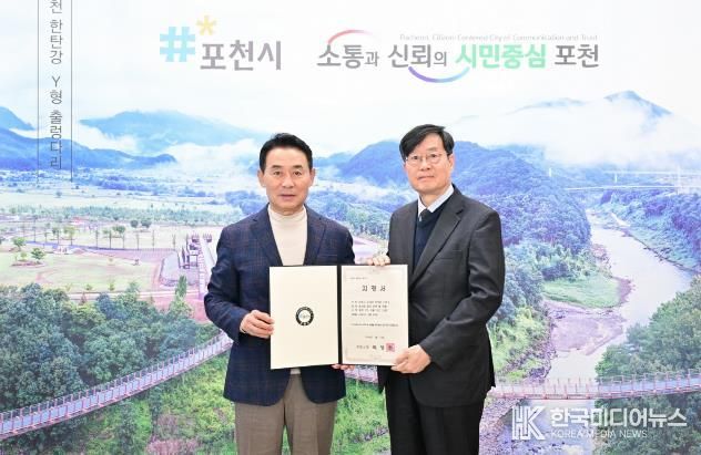 [ 한국미디어뉴스 김서안 기자 ] 포천시는 지난 10일 포천시장 집무실에서 ‘윤세징 일가 묘역 및 석물’ 향토유산 지정서 수여식을 개최하고 파평윤씨 종중 윤경환 회장에게 지정서를 전달했다.