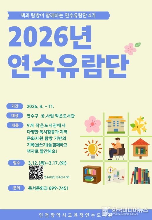 [ 한국미디어뉴스 이원영 기자 ] 인천광역시교육청연수도서관은 12일부터 연수구 소재 작은도서관을 대상으로 지역 연계 프로그램인 ‘연수유람단’ 참여기관을 모집한다.