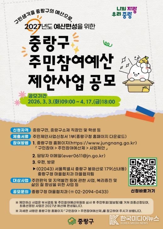 [ 한국미디어뉴스 이원영 기자 ] 중랑구가 2027년도 예산에 반영할 주민참여예산 사업을 발굴하기 위해 오는 3월 3일부터 4월 17일까지 총 11억 원 규모의 주민참여예산 제안사업 공모를 실시한다.