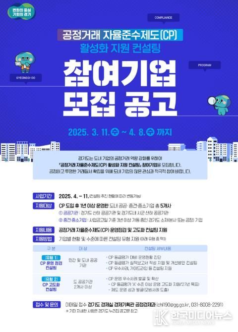 [ 한국미디어뉴스 김일규 기자 ] 경기도가 기업의 공정거래 자율준수 문화 확산과 경영 애로 해소 지원을 위해 ‘공정거래 자율준수제도(CP, Compliance Program) 활성화 지원 컨설팅’을 추진한다.
