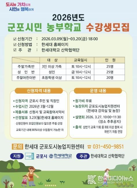 [ 한국미디어뉴스 이보영 기자 ] 군포시 도시농업 활성화 지원사업 보조사업자인 한세대학교가 오는 3월 20일까지 2026년도 군포시민 농부학교 신규 수강생을 모집한다고 밝혔다.