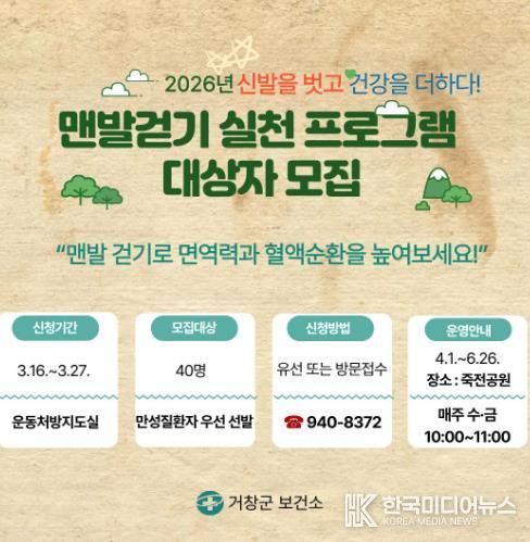 [ 한국미디어뉴스 김홍철 기자 ] 거창군은 오는 16일부터 27일까지 맨발걷기에 관심 있는 지역주민(만성질환자 우선)을 대상으로 ‘맨발걷기 실천 프로그램’ 참여자 40명을 모집한다.