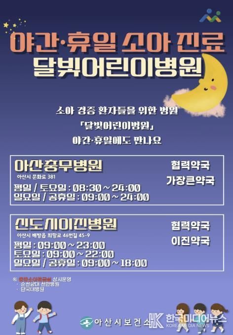 아산시 관계자는 “달빛어린이병원을 통해 야간·휴일 경증 소아 진료 공백을 보완하고, 중증 환자는 대학병원 중심의 권역 의료체계로 대응하고 있다”며 “아이를 키우는 부모들이 밤이나 휴일에도 안심하고 의료 서비스를 이용할 수 있도록 소아 진료 체계를 지속적으로 보완해 나가겠다”고 말했다.