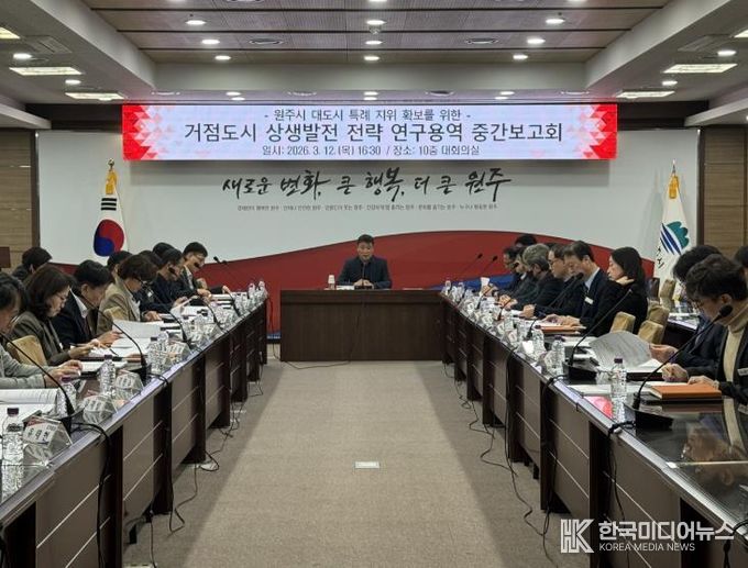 [ 한국미디어뉴스 이원영 기자 ] 원주시는 지난 12일 시청 10층 대회의실에서 대도시 특례 지위 확보를 위한 ‘거점도시 상생발전 전략 연구용역’ 중간보고회를 개최했다.