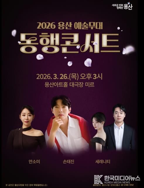 [ 한국미디어뉴스 이원영 기자 ] 서울 용산구가 오는 26일 오후 3시, 용산아트홀 대극장 미르(녹사평대로 150, 지하 2층)에서 ‘2026 용산 예술무대 동행콘서트’를 개최한다. 바쁜 일상에 지친 구민들에게 따뜻한 위로를 전하기 위한 자리다.
