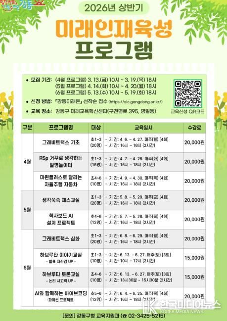 [ 한국미디어뉴스 이원영 기자 ] 서울 강동구는 초등학생의 창의적 사고력과 문제해결 역량을 키우기 위해 2026년 상반기 ‘미래인재 육성 프로그램’을 운영한다고 밝혔다.