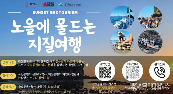 [ 한국미디어뉴스 이종철 기자 ] 부안군은 2026년 지오관광 활성화를 위해 전북 서해안 유네스코 세계지질공원과 변산반도 생태탐방원이 협력해 ‘노을에 물드는 지질여행(Sunset Geotourism)’ 프로그램을 이달부터 모집·운영한다고 밝혔다.
