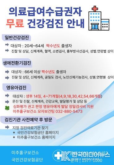 [ 한국미디어뉴스 최치남 기자 ] 인천 미추홀구가 의료 취약계층의 질환을 조기에 발견하고 건강 증진을 도모하기 위해 ‘의료급여 수급권자 일반·영유아 건강검진 수검’을 적극 독려하고 있다.