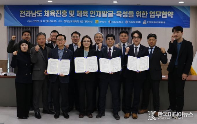 [ 한국미디어뉴스 이종철 기자 ] 전라남도는 17일 전남도체육회에서 전남도교육청, 대한민국체육인재개발원, 전남도체육회와 함께 ‘전남 체육진흥 및 체육인재 발굴·육성을 위한 업무협약’을 하고, 지속 가능한 체육 인재 육성체계 구축에 나섰다.