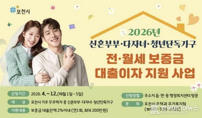 [ 한국미디어뉴스 김서안 기자 ] 포천시는 ‘2026년 신혼부부·다자녀·청년가구 전월세 보증금 대출이자 지원사업’을 추진한다.